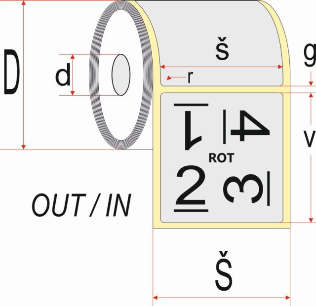 - When placing an order, the customer specifies the required technical material and dimensional parameters of the label, the parameters of rotation and winding of the label, usually in millimetres, according to the figure - in particular the height of the label = v, width = w, roll width = Š, core diameter = d, roll diameter = D, gap between labels = g, corner rounding = r, label rotation = ROT, outer OUT or inner IN label winding and number of pieces per roll (pcs/roll). The same applies to thermal transfer ribbons. The dimensional tolerances of the individual parameters are standard: +- 0.1mm for the cut-out of the labels themselves (label body), +- 1.0mm for the carrier strip ( ) / cutting and portioning / core parameters and other parameters. If the customer does not specify any of the parameters, the seller assumes that this parameter can be adapted to its capabilities or common standards.